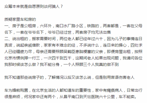 但也有网友提出质疑,称吴鹤臣家里在北京有两套房、一辆车,大病也有医保,怎么会需要众筹100万?