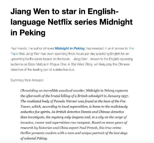 有消息称,姜文将主演Netflix剧集《午夜北平》?