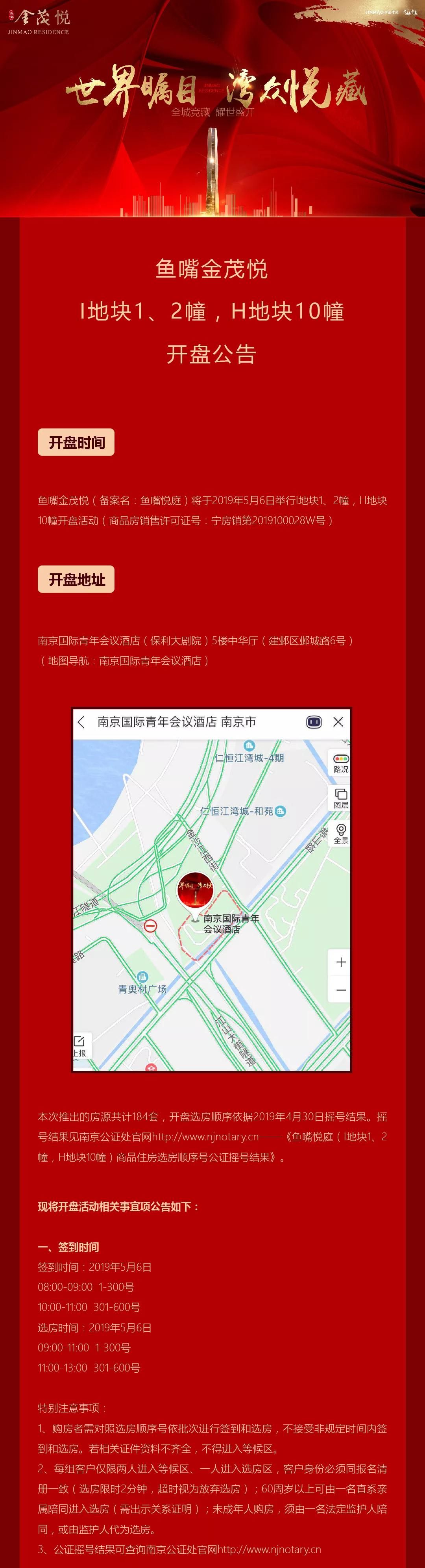 4月29日,位于河西鱼嘴的鱼嘴金茂悦摇号结果出炉,共5851组有效购房者摇184套房,中签率仅3%。项目将于明天上午9点在南京国际青年会议酒店5楼中华厅正式开盘选房。成功选房客户当天需缴纳10万元定金。此外,购房者需在5月7日-5月9日之间至项目售楼处签约,并缴纳不低于5成的首付并办理按揭。