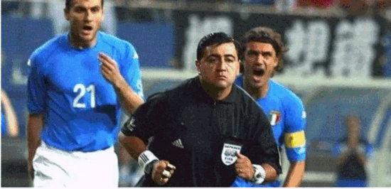 2002年日韩世界杯1/8决赛意大利VS韩国的比赛中,当值主裁判莫雷诺先是送给东道主韩国队一个有争议的点球,随后在下半场时,意大利队的赞布罗塔被韩国队的黄善洪铲伤下场,然而黄善洪并没有受到任何处罚。加时赛中,莫雷诺又以假摔为名红牌罚下意大利主力球员托蒂。此后,意大利球员维埃里妙传反越位插上的托马西,后者轻松晃过韩国门将后将球踢进球门,莫雷诺却判罚托马西的球越位,为无效进球。终场前,韩国队球员安贞焕头球绝杀意大利,进入八强。那场比赛,意大利队全队领到6张黄牌,一张红牌,此外,还被罚了一个点球。