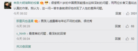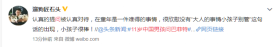 小男孩的提问引起了网友的关注,有网友回忆起自己的11岁,称自己那时候还在“抄作业”、“看动画片”、“连巴菲特都不知道”。