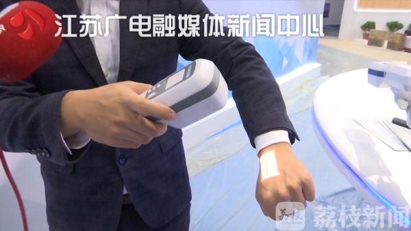 来自中科院硬科技应用成果展区的廖宇焜向记者展示了一款医疗黑科技——红外血管成像仪,很多老人、小孩或者是有色人种的血管比较难找,通过这个仪器的照射,会呈现出色差,就可以很清楚地找到血管。