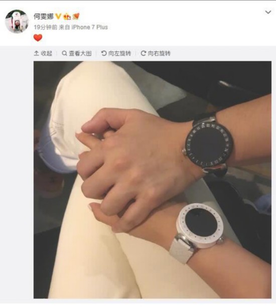 何雯娜在社交平台上晒出了一张两手相握的照片,两人手腕上带着黑白两色的情侣表,何雯娜配文是一个爱心,疑似恋情公布。
