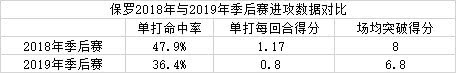 失误多,这是保罗在本赛季季后赛的一个大问题,他在上赛季季后赛的助攻失误比达到3.1,而本赛季季后赛只有1.4。我们将数据细化到两年两次火勇系列赛,2018年火勇之战保罗参加5场总计失误9次,而2019年火勇系列赛才打了3场,保罗就已经失误了11次,其中有9次失误出现在系列赛前两场。