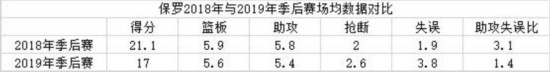 数据为证,本赛季季后赛中的保罗,与上赛季相比除了抢断之外,其他主要数据都出现不同程度的下跌,其中两项最为“刺眼”,一是得分,二是失误。