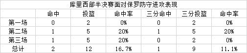 在本赛季西部半决赛期间,保罗是防守库里回合数最多的火箭球员,他63个回合防库里,如上表所示,库里在这63个回合中总计12投2中三分球9中1,投篮表现大大低于他的正常水平。