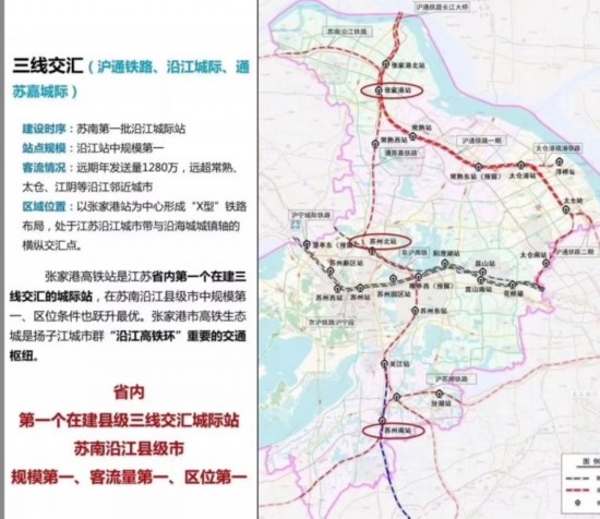 其中,张家港高铁枢纽区规划面积约5.7平方公里,沪通铁路、南沿江高铁及通苏嘉甬高铁在此交汇设张家港枢纽站,这也是省内第一个在建的三线交汇城际站。