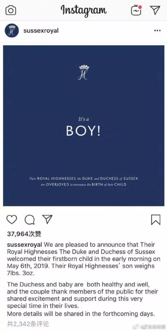 英国哈里王子夫妇官方Instagram账号发布了这一消息。