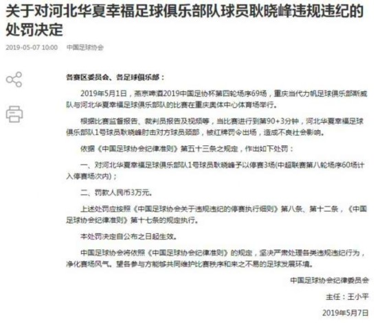 腾讯体育5月7日讯 北京时间今天上午,中国足协开出了一张罚单,在上周的足协杯重庆斯威与河北华夏幸福的比赛中,河北门将耿晓峰在发球时肘击了重庆球员元敏诚,耿晓峰也因为这个动作染红下场。不过这几天,元敏诚似乎也受到了不小的压力,他在社交媒体发生,表达不解。