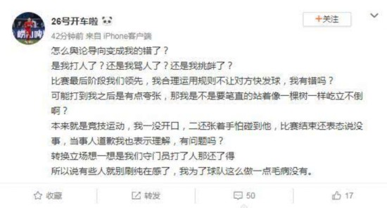 元敏诚写道:“怎么舆论导向变成我的错了?是我打人了?还是我骂人了?还是我挑衅了?比赛最后阶段我们领先,我合理运用规则不让对方快发球,我有错吗?可能打到我之后是有点夸张,那我是不是要笔直的站着像一棵树一样屹立不倒啊?本来就是竞技运动,我一没开口,二还张着手怕碰到他,比赛结束还表态说没事,当事人道歉我也表示理解,有问题吗?转换立场想一想是我们守门员打了人那还了得!所以说有些人就别刷纯在感了,我为了球队这么做一点毛病没有。”