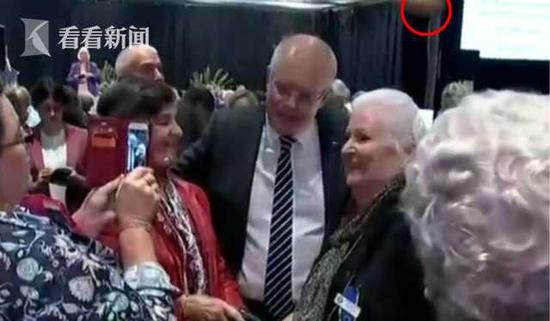 莫里森今天上午现身新南威尔士州奥尔伯里,出席在当地举行的乡村妇女协会的活动。现场画面显示,一位手持整盒蛋的女子从莫里森身后经过,然后对莫里森发起了“蛋袭”。安全人员当场把这名女子控制住,随后带走。期间,一名老妇人被撞倒,一度喘不过气。莫里森伸手将这名老妇人扶起,并给了她一个拥抱。