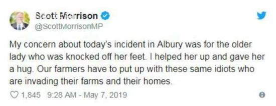 莫里森此后在社交媒体发文表示,“对于今天在奥尔伯里发生的事,我关心的是那名被撞倒的老妇人。我帮助她站起来,并给了她一个拥抱。我们的农民不得不忍受这群入侵他们农场、家园的一样的白痴。”