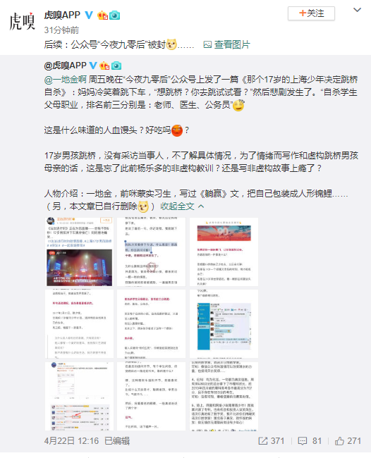 4月19日,博主@一地金啊在“今夜九零后”公众号上发了一篇《那个17岁的上海少年决定跳桥自杀》文章,内文引发大量讨论后被删,随后@虎嗅APP透露@一地金啊为前咪蒙实习生,写过《躺赢》文,把自己包装成人形锦鲤,目前该公号被封。