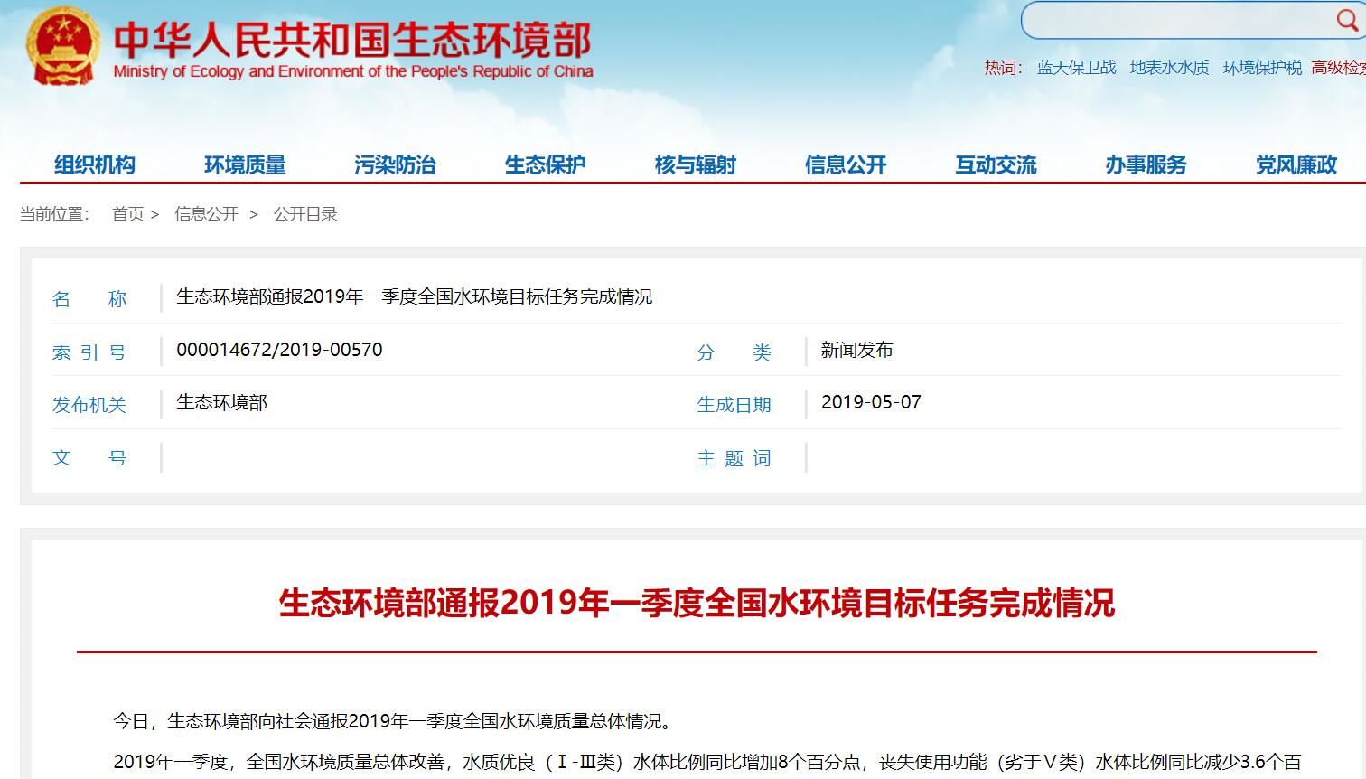据生态环境部网站消息,5月7日,生态环境部向社会通报2019年一季度全国水环境质量总体情况。