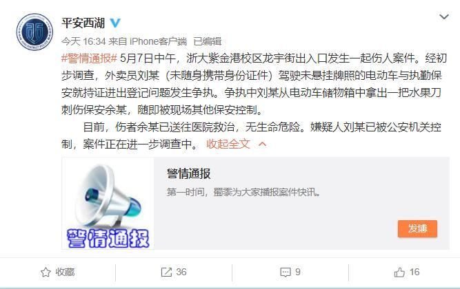荔枝新闻讯 浙江大学紫金港校区一保安被外卖员刺伤一事引发关注。5月7日下午,杭州市公安局西湖区分局官微@平安西湖发布了一则警情通报。