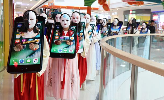 在网上的热传视频中,山西运城东康一中的学生戴着面具,身上背着手机模型,看起来像是戴着“手机枷锁”,学生们也戴着模型在商场和广场上缓慢行走。而在这一视频在网上转开后,引发了不少网友热议。