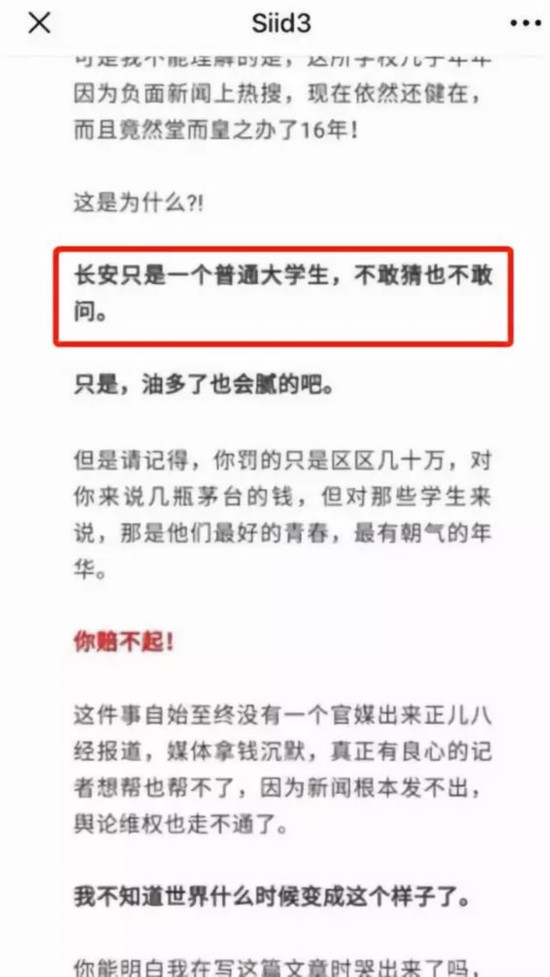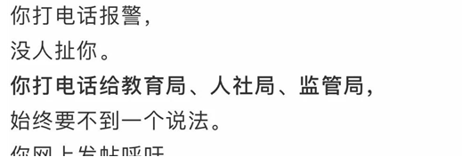 “许长安”文章称,“你打电话报警,没人扯你,你打电话到教育局、人社局、监管局,始终要不到一个说法”
