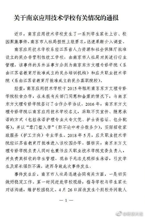 4月29日,南京市人力资源和社会保障局官方微博 @南京人社 发布了 《关于南京应用技术学校有关情况的通报》 。