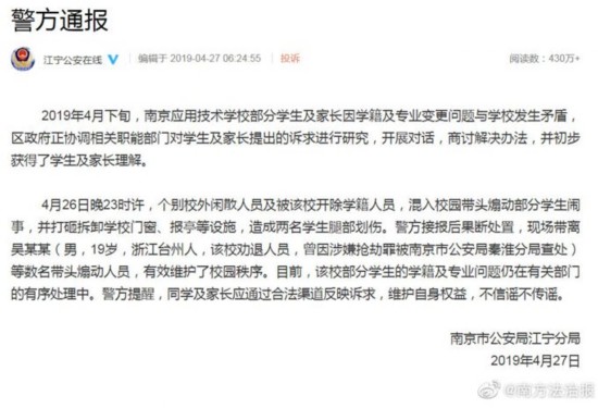 4月27日,南京市公安局江宁分局发布通报称,2019年4月下旬,南京应用技术学校部分学生及家长因学籍及专业变更问题与学校发生矛盾,区政府正协调相关职能部门对学生及家长提出的诉求进行研究,开展对话,商讨解决办法,并初步获得了学生及家长理解。