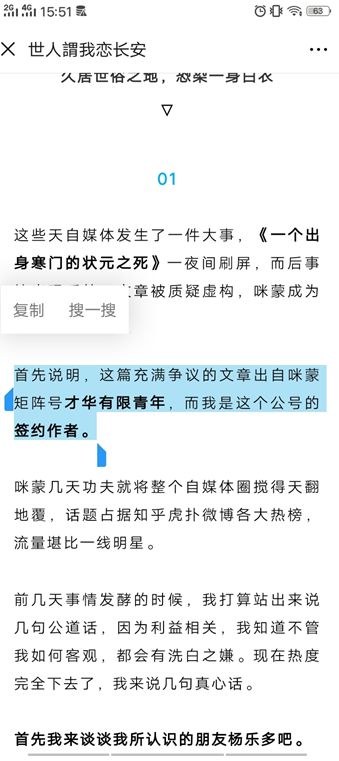 在这个拜年下方,“世人謂我恋长安”2月3日有一篇文章,《听说,天下苦咪蒙久矣?》,作者“桉宇树”,在评论“咪蒙 ” 旗下公众号“才华有限青年”造谣文章《一个出身寒门的状元之死》时,称 “这篇充满争议的文章出自咪蒙矩阵号才华有限青年,而我是这个公号的签约作者。”
