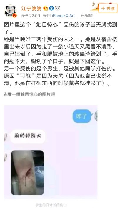 “许长安”在文中晒出一张小腿割伤的照片,然而根据微博账号 @江宁婆婆 辟谣称,图片里这个“触目惊心”受伤的孩子当天就找到了。她是当晚唯二两个受伤的人之一。 她是从宿舍楼里出来以后因为走了一条小道天又黑看不清路,自己摔倒了,手和腿被地上的玻璃渣给划了,手问题不大,腿划了个口子,就是下图这个。 另一个受伤的是个男生,是被其他同学打伤的。原因“可能”是因为天黑(因为他自己也说不清,他是在打砸东西的时候莫名就挂彩了)。