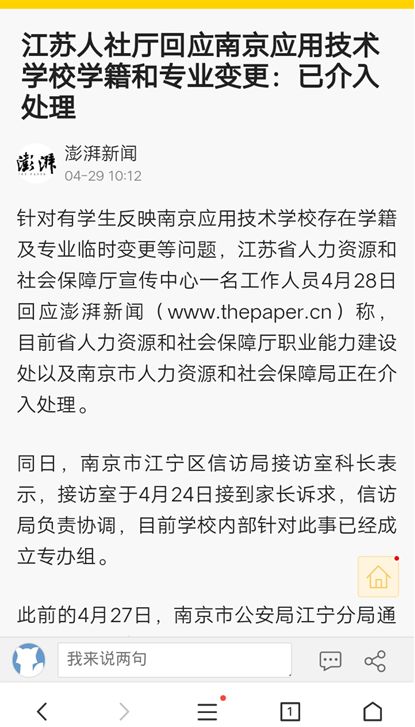 十几天前,网上陆续有自称是南京应用技术学校的学生在上寻求帮助,曝光学校没有学籍、所学专业与实际不符、与学校保安发生肢体冲突等问题。