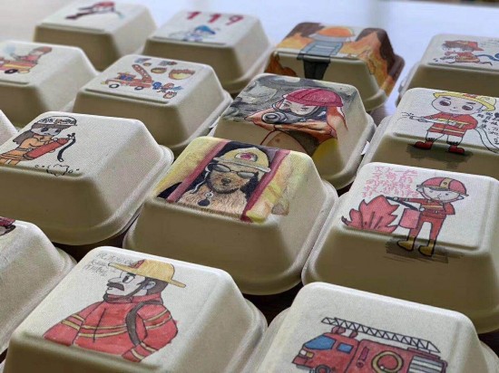 据送蛋糕的爱心市民介绍,这些手绘画是他女儿和一起学画的同学绘制的。这位市民说他看到前段时间四川凉山木里山火,30多位消防员壮烈牺牲,内心感触颇深,于是向自己正在上小学的女儿讲述了那些消防员的故事。他的女儿也很受感动,便和一同学习绘画的同学手绘了这些盒子。孩子们希望能通过自己的行动,感谢身边的消防员叔叔们。