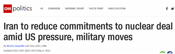美国的经济制裁与军事施压步步紧逼,CNN7日的头条报道称,伊朗预计在周三(5月8日)宣布减少对2015年签署的国际核协议的承诺。2018年5月8日,美国总统特朗普宣布退出伊朗核协议。时隔一年,伊朗方面6日表示,该国将不再履行协议中作出的部分承诺,作为对美国收紧(对伊)制裁的回应。