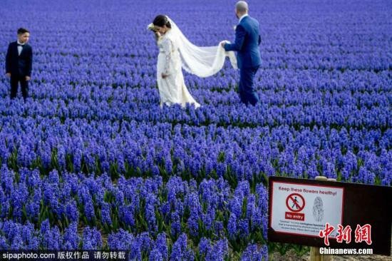 资料图:荷兰风信子花田进入盛放期,游客不顾禁令在蓝色花田中拍照。图片来源:Sipaphoto版权作品 禁止转载