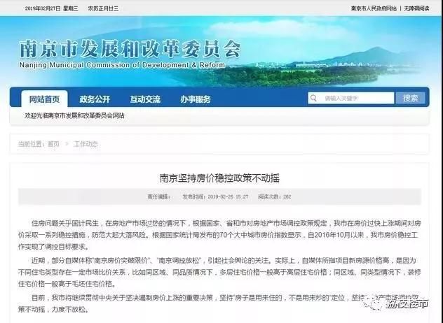 其实早在2月26日的下午,南京市发改委官网上就发布了“南京坚持房价稳控政策不动摇”,明确表示南京市将继续贯彻中央关于坚决遏制房价上涨的重要决策,坚持“房子是用来住的,不是用来炒的”定位,坚持房地产市场调控政策不动摇,力度不放松。