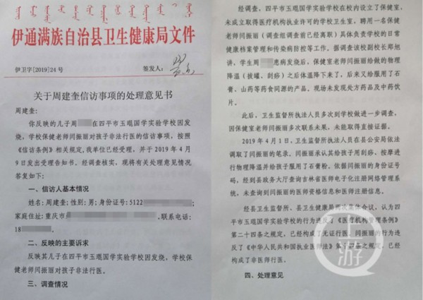 伊通满族自治县卫生健康局出具的处理意见书。 本文图片均来自上游新闻官方认定玉琨学校无证行医
