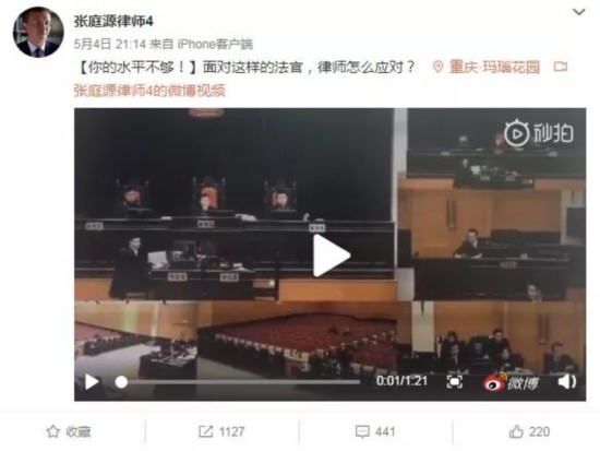 5月4日,重庆律师张庭源在自己的微博里(@张庭源律师4)上传了一段1分21秒的视频,并给此段视频附题为“【你的水平不够!】面对这样的法官,律师怎么应对?”在网上引发热议关注。