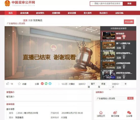 尚法新闻注意到,此次庭审直播是广东省高级人民法院公开开庭审理的一起贩卖毒品案,案号为(2016)粤19刑初299号,开庭时间2019年02月27日,被告人共四人,分别为张一敏、林天成、黄国锋、傅文辉,整个庭审过程持续近5个小时。