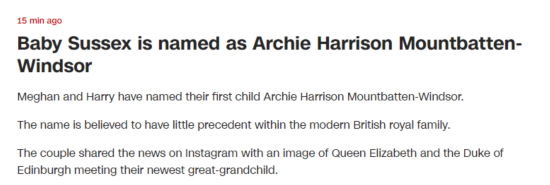 海外网5月8日电 据美国有线电视新闻网(CNN)消息,8日,英国萨塞克斯公爵哈里王子和公爵夫人梅根殿下给他们刚刚出生的儿子取名为阿尔奇·哈里森·蒙巴顿-温莎(Archie Harrison Mountbatten-Windsor)。