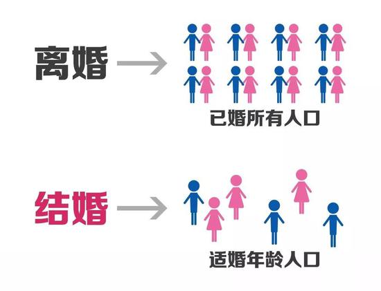 离婚对应的是已婚的所有人口,是个大区间;而结婚主要对应适婚年龄人口,是个小区间。