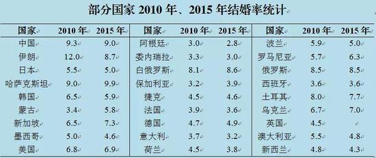 联合国《人口统计年鉴2016》罗列了包括中国在内的27个国家2010年与2015年的结婚率数据。从全球范围看,绝大多数国家的结婚率都出现了下降。
