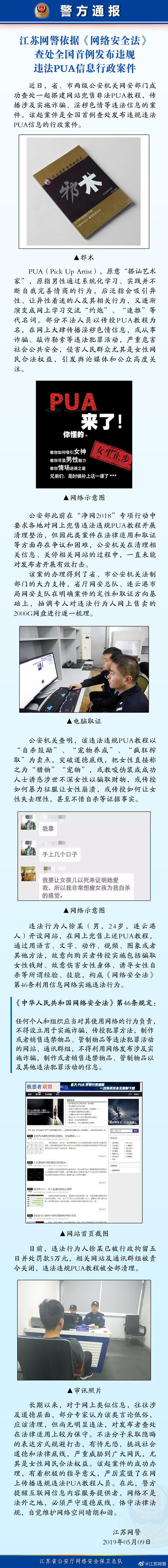 新京报快讯 据江苏省公安厅网络安全保卫总队消息,自杀鼓励、宠物养成、疯狂榨取……江苏网警查处全国首例发布违规违法PUA信息行政案件。