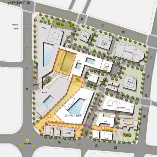 忠林坊A地块中的新建筑(8层,50米高)与德基一期围合,形成条形广场。(下图广场3)