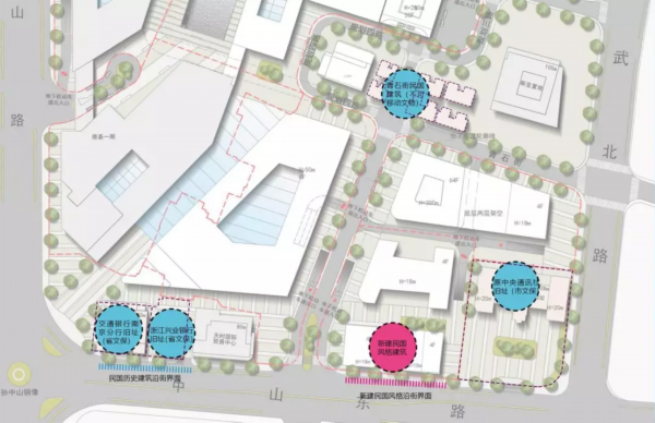 在历史建筑保护和利用上,规划对区域内各自孤立的、保存状况不同的、各级别的民国时期历史建筑进行系统的保护、修缮、利用。远期拟在中山东路沿线新建民国风格沿街建筑,形成临街的民国历史建筑界面。