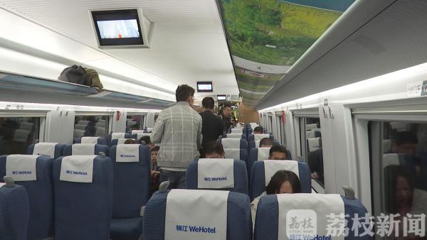 上午,杭州市民栾先生带着家人坐G34高铁去安徽游玩。作为“溧阳1号公路”品牌列车首发车的乘客,他看到车厢里溧阳美丽风光,为之赞叹。