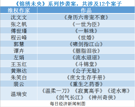 涉嫌抄袭200余本小说,多达2000余万字的《锦绣未央》,从2016年9月到2017年2月,先后被沈文文、张之帆、傅世瑾、程云峰等在内的12位作者陆续起诉,堪称有史以来抄袭比例和维权规模最大的侵权案件。