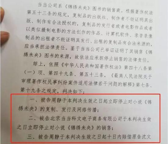 王国华告诉每经记者,5月8日北京市朝阳区人民法院知识产权庭依法对“沈文文诉周静及当当网案件”公开宣判。被告周静侵权成立,判决生效之日起10日之内赔偿原告沈文文经济损失12万元及维权开支1.65万元,共计13.65万元。同时,被告周静还需在判决生效之日起立即停止对小说《锦绣未央》的复制、发行及网络传播;被告当当网于判决生效之日立即停止对小说《锦绣未央》的销售。