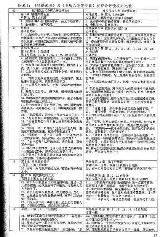 《锦绣未央》“首案”判决书中部分抄袭证明 图片来源:每经影视获王国华律师同意后发布