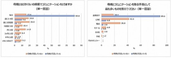 而关于“与母亲联系的方式”,住在一起的被调查者中有89.6%为“直接说话”,没有住在一起的被调查者中比例最高的为“使用LINE”,占42%。关于“对你来说,母亲是怎样的角色”的问题,26.6%的被调查者认为是“支持者”。同时,回答“友人”和“亲友”的也各占15.0%。由此可见,有三成女儿认为母亲是自己的好朋友。