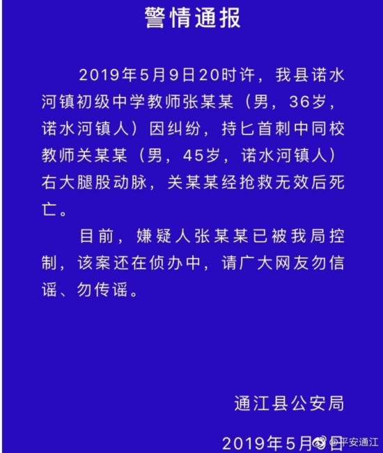 通报称,教师张某某(男,36岁,诺水河镇人)因纠纷,持匕首刺中同校教师关某某(男,45岁,诺水河镇人)右大腿股动脉,关某某经抢救无效后死亡。目前,嫌疑人张某某已被该县公安局控制,案件还在侦办中,请广大网友勿信谣、勿传谣。