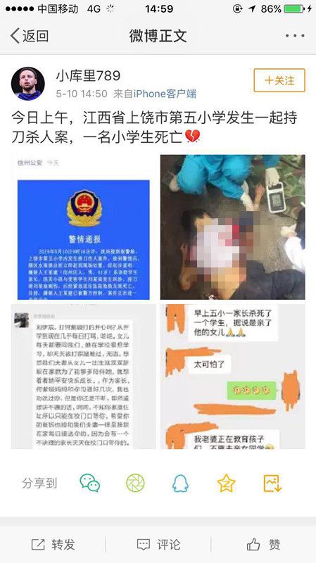 上饶10岁男生校内被女同学家长刺死 嫌疑人被控制