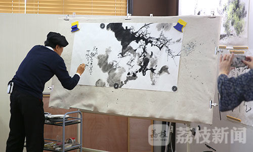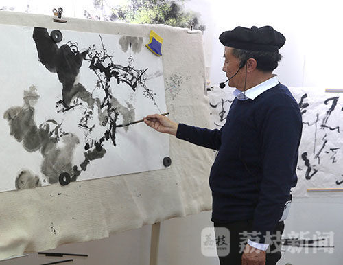 在讲座上,蒋正义老师现场示范,为大家展示了执笔作画的全过程。只见他沉稳平静铺纸、凝神聚力运气,一幅水墨淋漓、酣畅尽致,枝干遒劲、凌寒挺立的写意梅花跃然纸上。