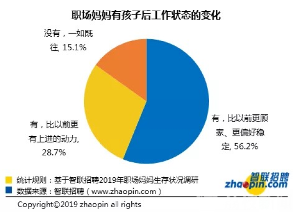 工作和生活的平衡对职场妈妈来讲,是一个更难攻克的障碍,调查数据显示,56.2%的职场妈妈认为生娃后个人心态上“比以前更顾家、更偏好稳定”了。
