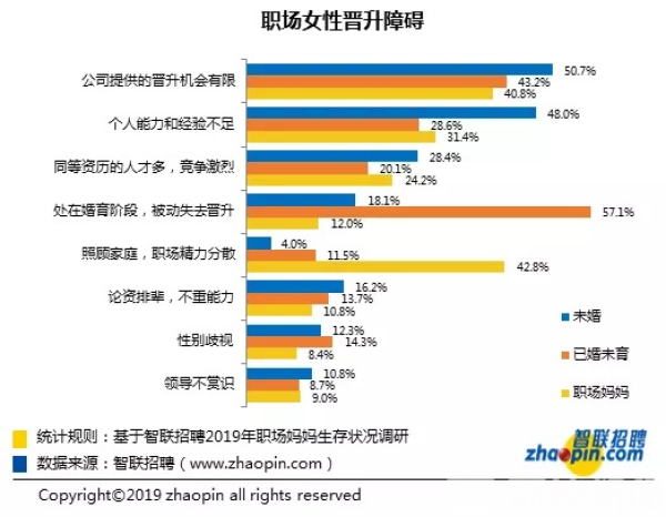 与事业信心指数的趋势一致,信心最弱的已婚未育人群对升职不抱希望的比例最高,占40.6%;其次是职场妈妈人群,对升职不抱希望的比例为39.5%;这一点未婚人群最乐观。