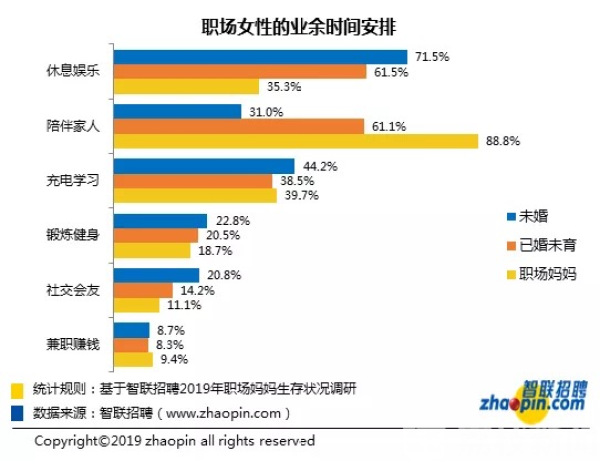 工作上斗志满满,职场妈妈们的生活也不轻松,88.8%的职场妈妈将业余时间用在陪伴家人方面;已婚未育人群则可以利用业余时间兼顾休息娱乐和陪伴家人;未婚女性的业余时间主要用于休息娱乐。